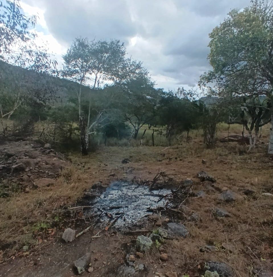 No entorno do imóvel, foram encontradas duas fogueiras recentes. Em uma delas havia apenas cinzas e brasas. A poucos metros, dentro do matagal, a polícia encontrou pinos para acondicionar cocaína e uma embalagem com odor característico de maconha.